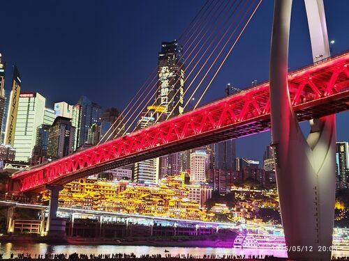 昨日、千廝門大橋を渡るとき、たくさんの人が河原から洪崖洞の夜景を見ていたので、河原からの夜景と、千廝門大橋の昨日と反対側の夜景を見に行く。 正式名称は「重慶千廝門嘉陵江大橋」。 「千廝門」は、かつてこの地域に存在した歴史的な関所の名称に由来…